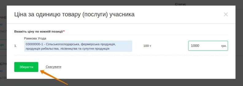 У вікні, що відкриється, необхідно вказати ціну та натиснути кнопку “Зберегти”. Ціни у цьому вікні повинні співпадати з тими, які постачальники на етапі кваліфікації додавали до своїх пропозицій.