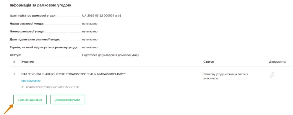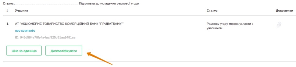 Щоб прийняти рішення по кожному з учасників, на сторінці лоту необхідно зайти у розділ “Інформація за рамковою угодою”.