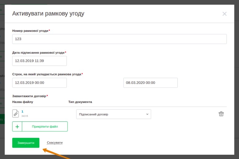 Наступний крок – активація рамкової угоди. Необхідно вказати номер, дату підписання та термін дії рамкової угоди, а також завантажити файл з договором (наприклад, сканована копія).