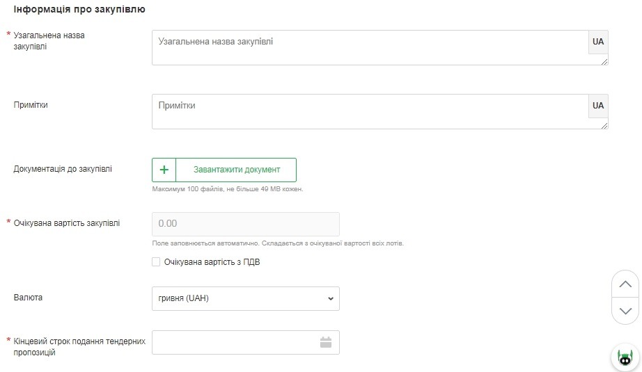 Очікувану вартість усієї закупівлі вказувати не треба – система її вирахує автоматично як вартість лоту у закупівлі.
