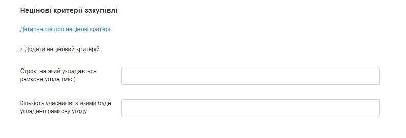 Додайте за необхідності нецінові критерії закупівлі та призначте їм вагу. Детальніше про нецінові критерії можна дізнатися за посиланням.