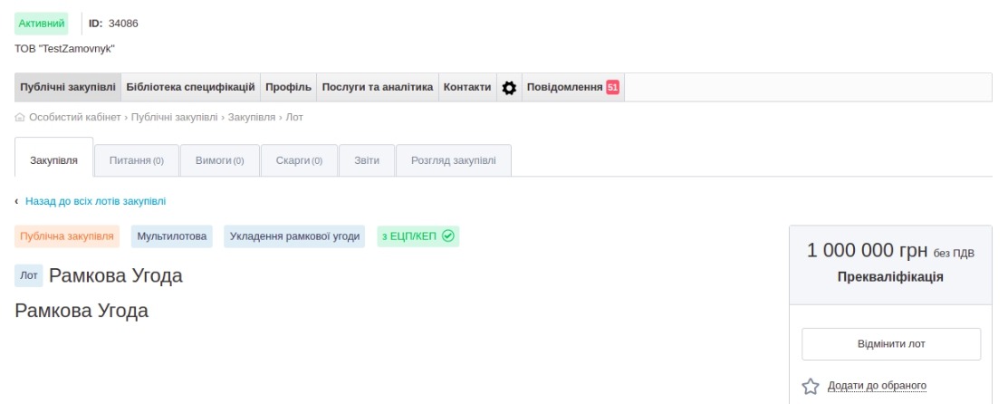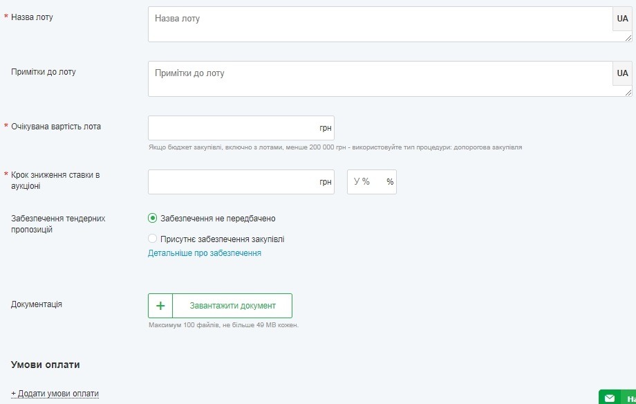 Рамкова угода є однолотовою, проте у одному лоті може бути декілька позицій. Додайте інформацію про лот: назву, очікувану вартість, крок зниження ставки. Поля, де є позначка мови, треба заповнювати українською та англійською.