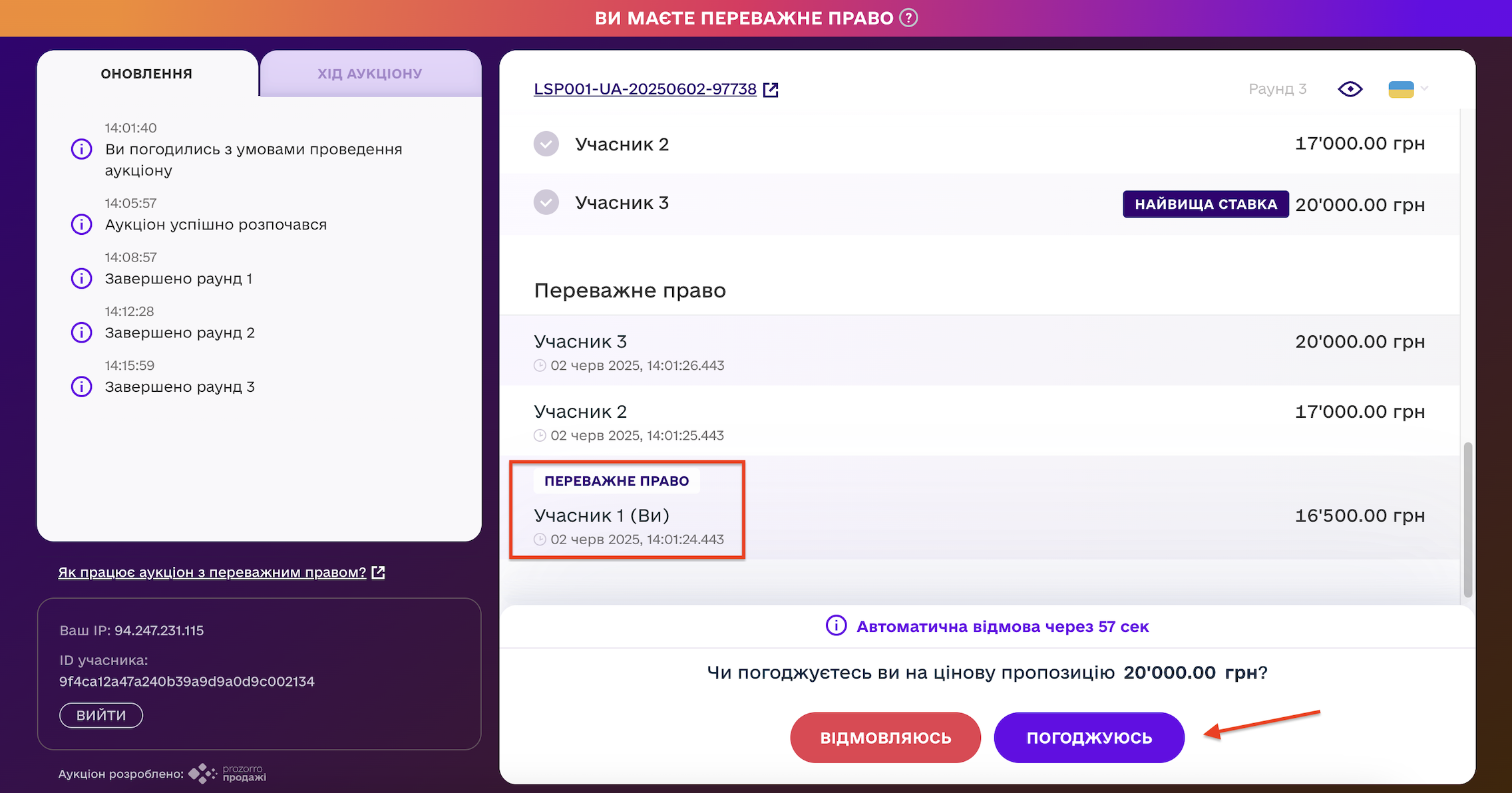 Якщо це аукціон з переважним правом, то після закінчення третього раунду у учасника, який має переважне право відкривається поле з пропозицією погодитись з максимальною ставкою чи ні.