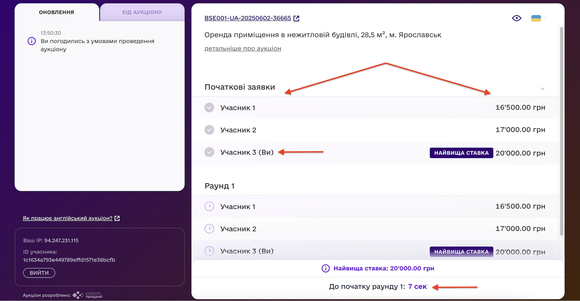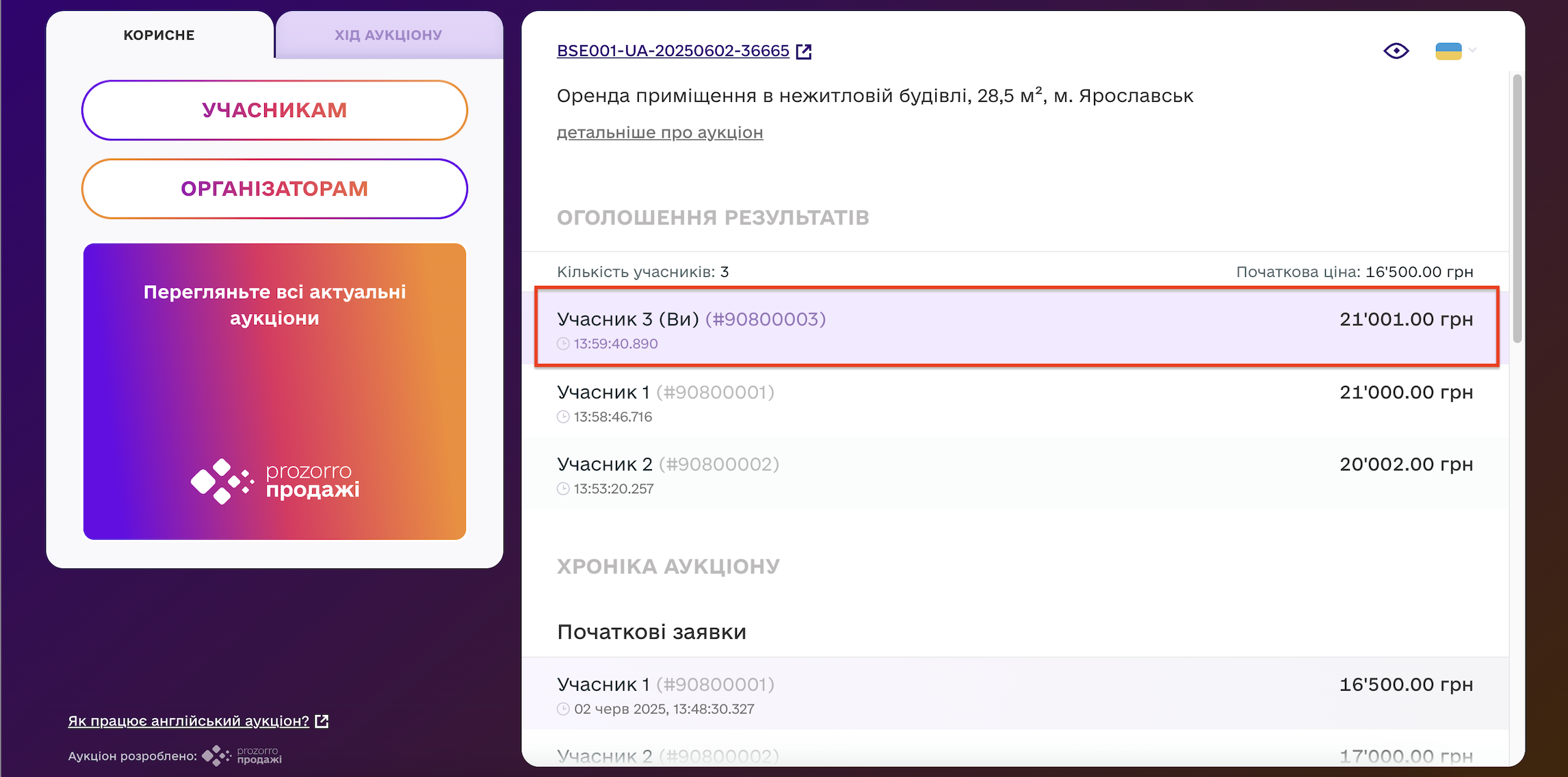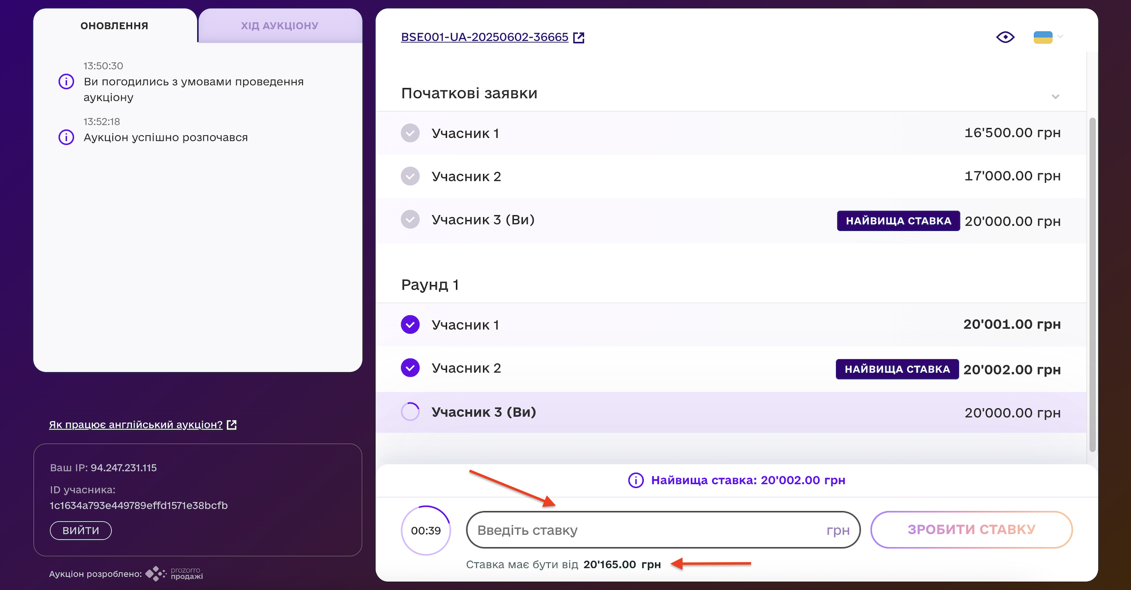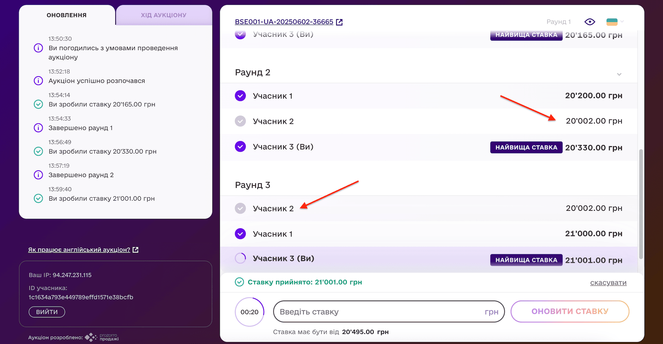 Після закінчення третього раунду система автоматично оголошує переможця – учасника, який зробив найвищу ставку.