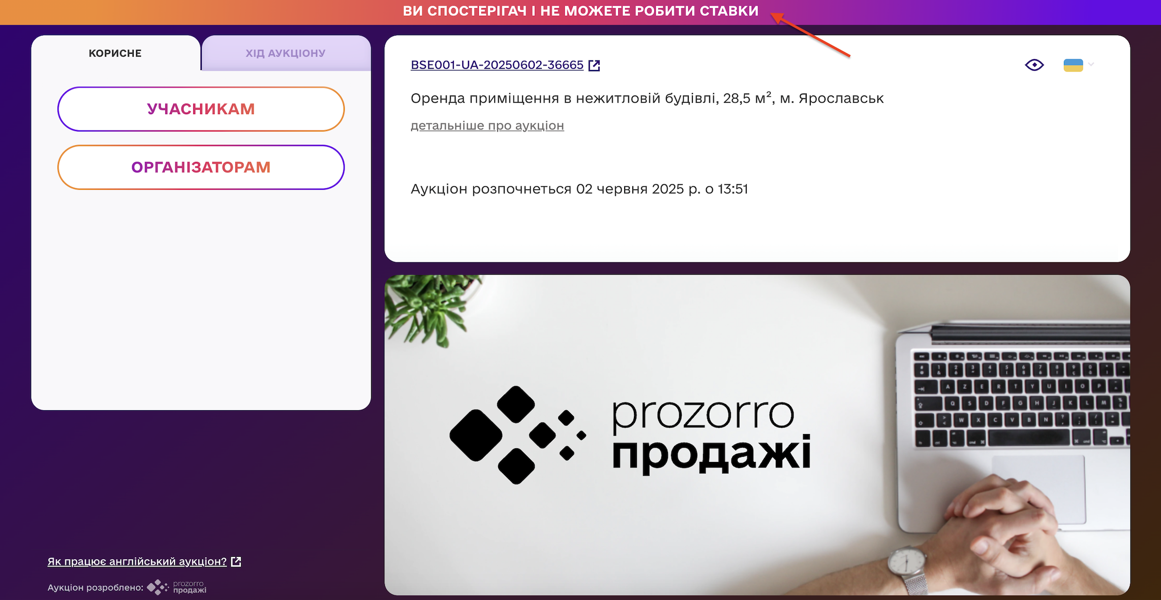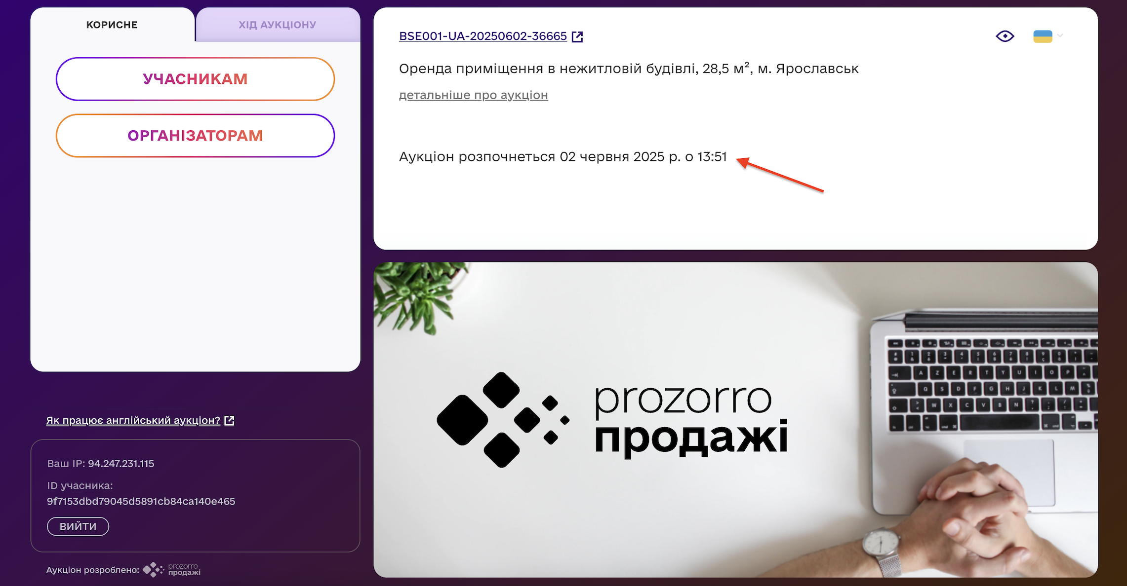 Учасники отримують посилання на аукціон в особистому кабінеті, яке стає активним за 15 хвилин до його початку. Але будь-хто може слідкувати за перебігом аукціону як спостерігач.