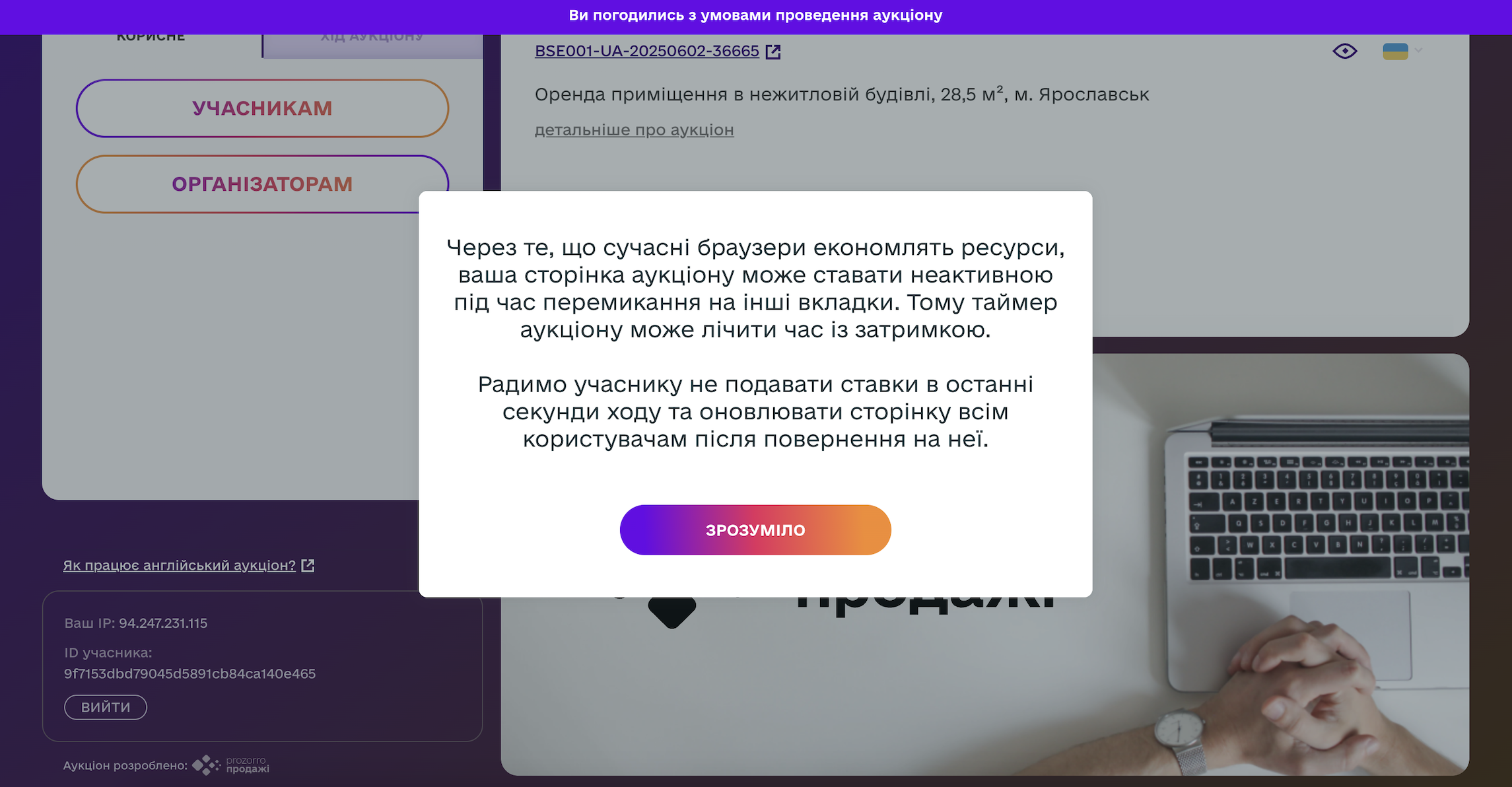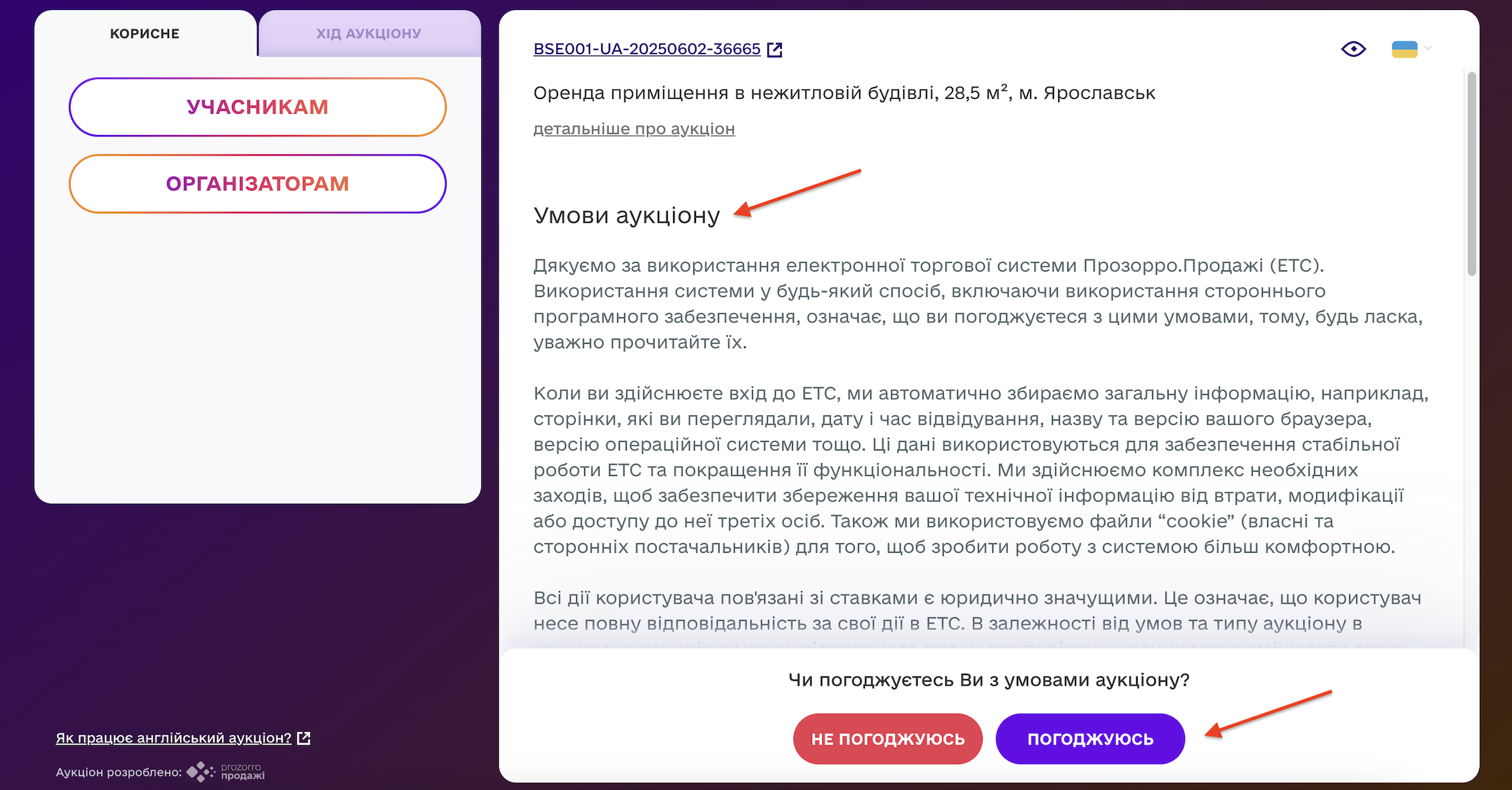 При переході за посиланням необхідно ознайомитись та погодитись з умовами аукціону: