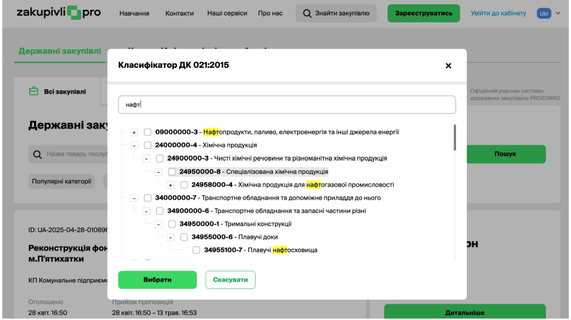 Щоб швидко знайти потрібний код, зручно скористатися пошуком на майданчику Zakupki.Pro, а для додаткової впевненості — звірити його з Єдиним закупівельним словником, який є офіційним джерелом.