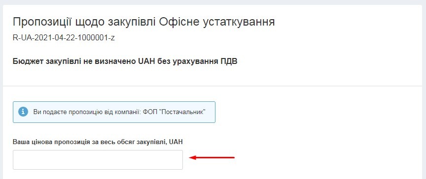 3. Вкажіть у полі “Ваша цінова пропозиція” початкову ставку згідно ТЗ замовника.