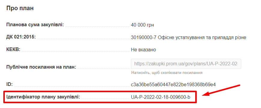 Якщо ви почали створювати закупівлю, то зв’язати з планом її можна вручну. Для цього відкрийте сторінку відповідного плану, скопіюйте ідентифікатор.