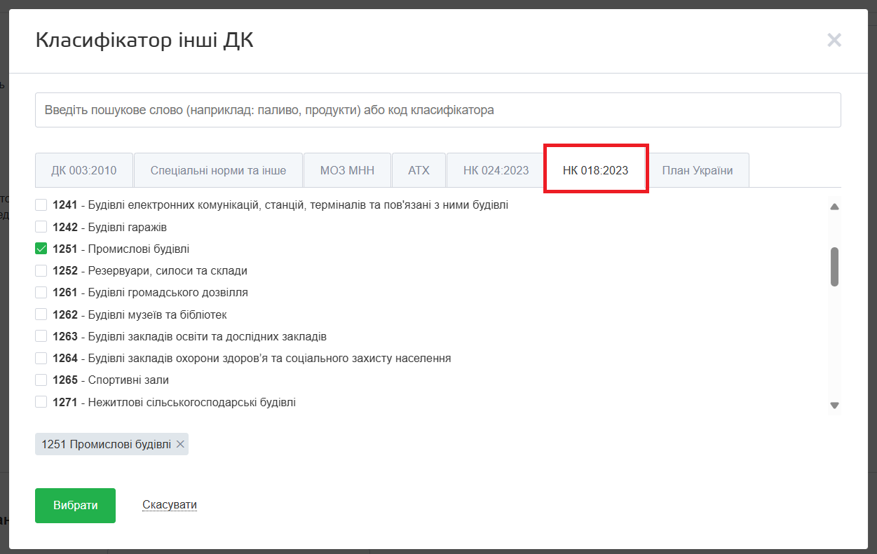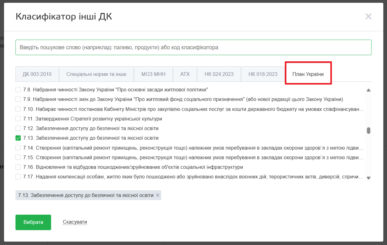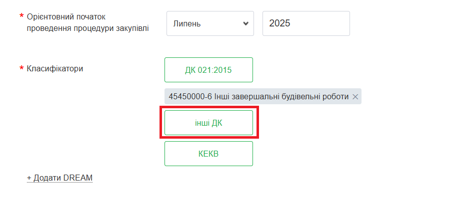 Таким чином публікуючи план на здійснення поточного ремонту на майданчику також треба зазначити код НК 018:2023. Для цього потрібно в блоці “Інформація про закупівлю” натиснути кнопку “Інші ДК” і вибрати потрібне значення у вкладці НК 018:2023.