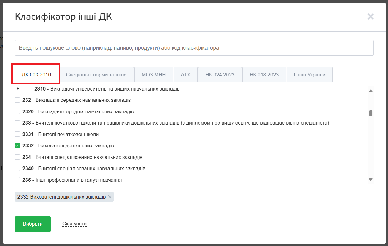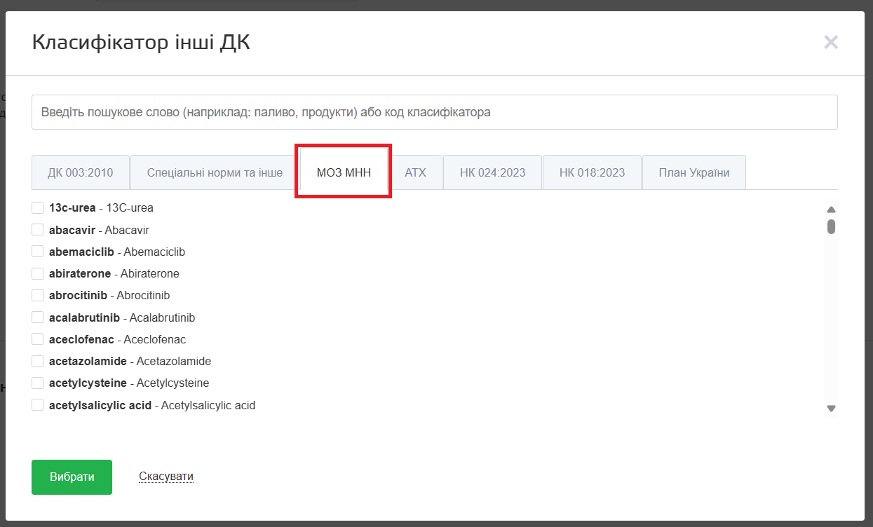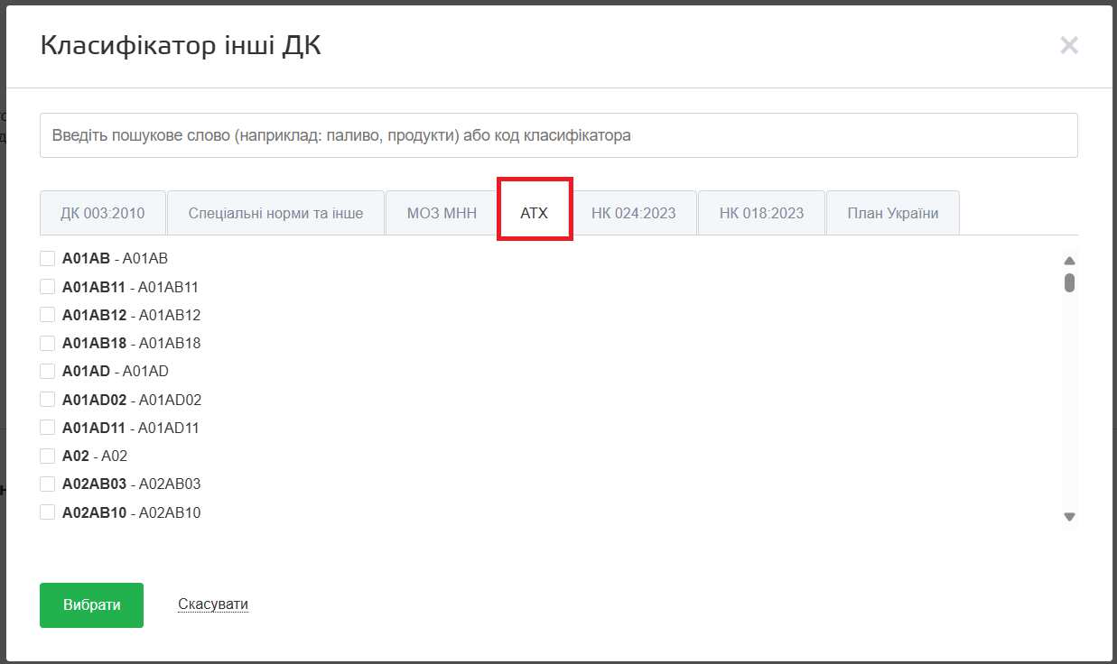- Якщо в майбутній закупівлі буде один лікарський засіб, можна зазначити МНН і АТХ аналогічно до описаного вище способу – натиснути кнопку “Інші ДК” і вибрати потрібні значення у відповідних вкладках.