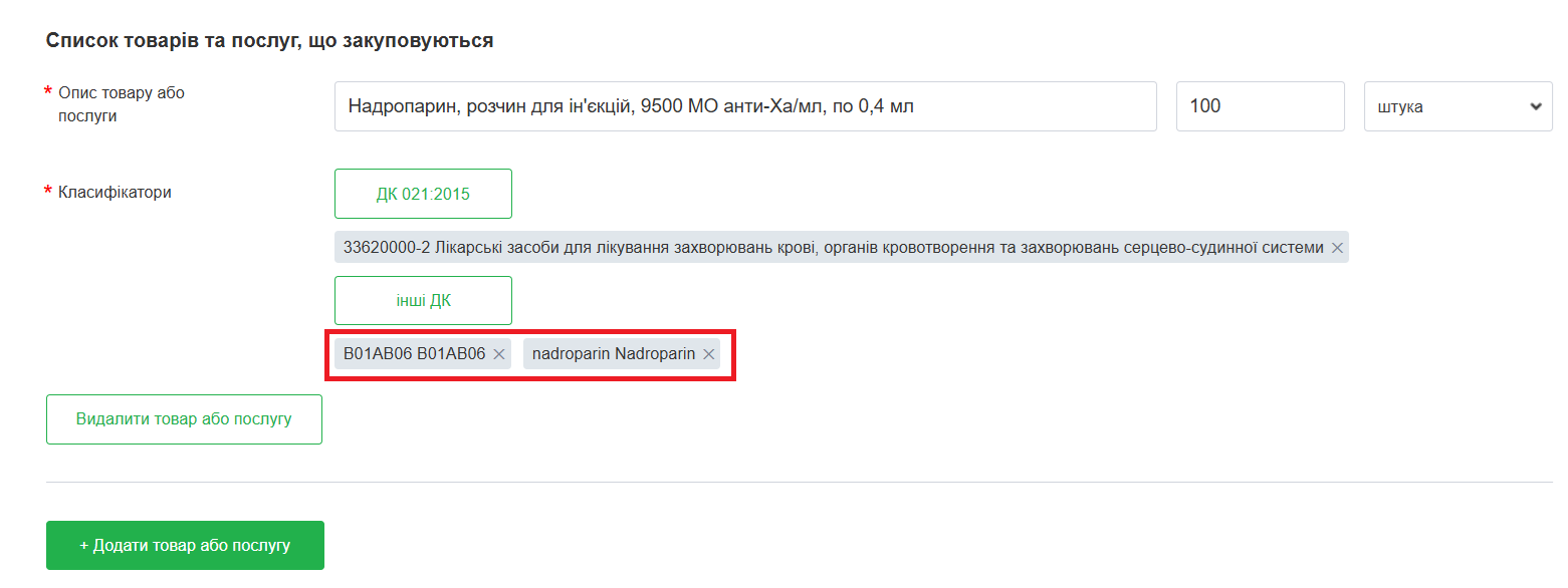 Знову ж таки, залежно від того, купуються один чи декілька медичних виробів, можна вибрати цей код до всієї закупівлі або ж до кожної номенклатурної позиції.