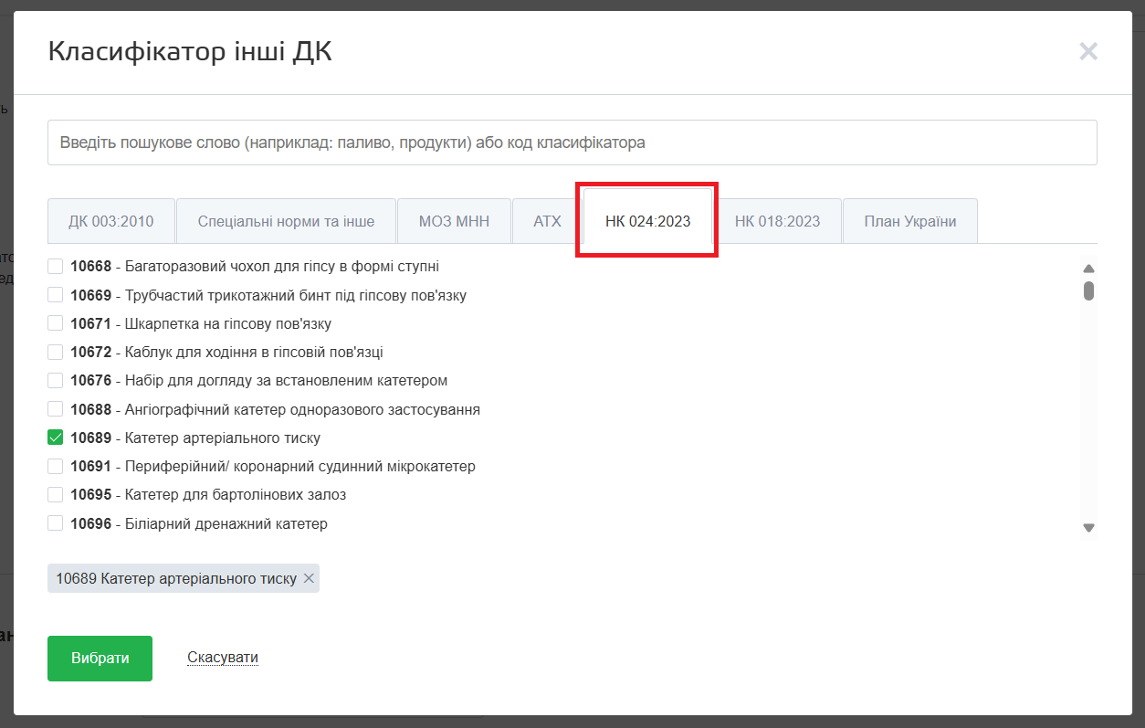 У разі закупівлі медичних виробів в плані слід окремо зазначати код та назву медичного виробу відповідно до національного класифікатора НК 024:2023 «Класифікатор медичних виробів», затвердженого Наказом № 4139 від 24.05.2023 року. Сам класифікатор можна переглянути тут. НК 024:2023 призначений для ідентифікації інструментів, апаратів, приладів, пристроїв, матеріалів або інших виробів, що належать до медичних виробів.