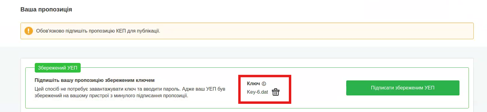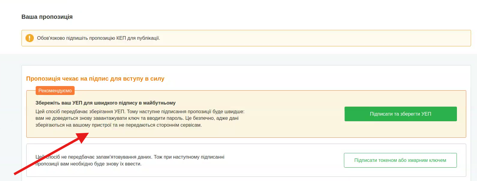 Під час подачі пропозиції в кабінеті ви побачите блок із повідомленням про можливість зберегти УЕП.