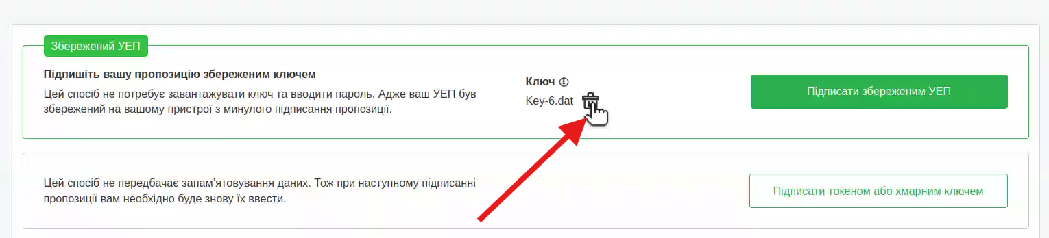 Система дозволяє мати лише один активний збережений ключ. Після видалення ви зможете завантажити й запам’ятати новий.