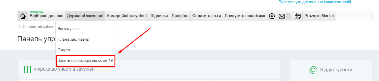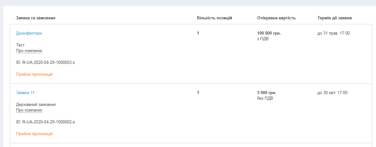 Щоб переглянути усі заявки, оберіть у розділі “Державні закупівлі” підрозділ “Запити пропозицій під covid-19”.