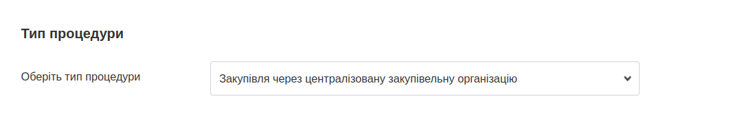 Тип процедури обираємо “Закупівля через централізовану закупівельну організацію”.