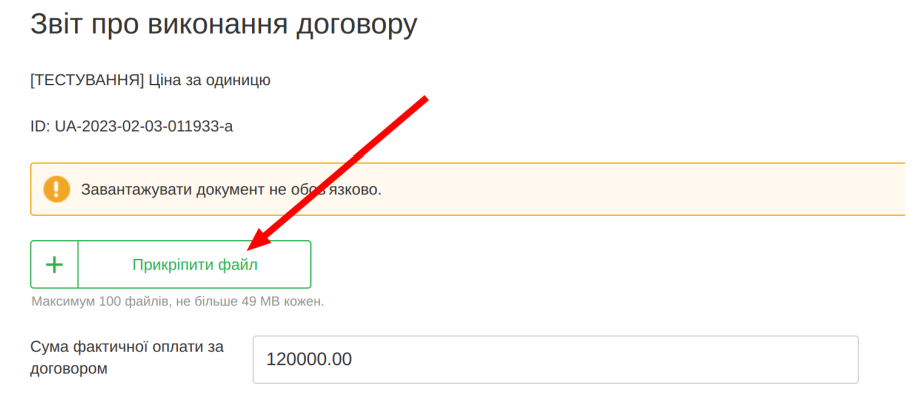 Під час звітування про виконання договору замовник не зобов’язаний публікувати будь-які додаткові документи. Проте внутрішніми розпорядком (положеннями, інструкціями, тощо) на уповноважену особу може бути покладений такий обов’язок. Тому на майданчику є можливість завантажити файли на етапі звітування.