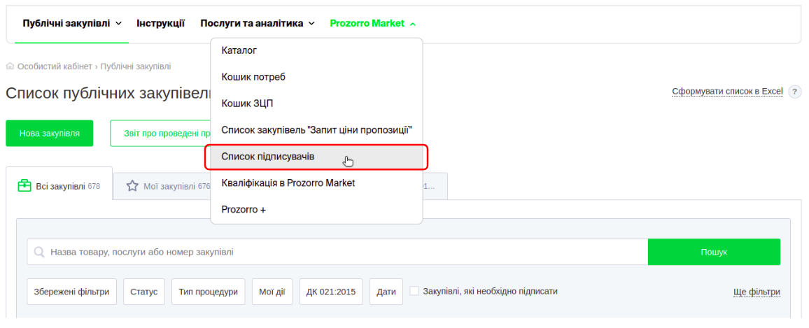 Для того, щоб замовнику внести підписувача, варто скористатися пунктом меню “Prozorro Market” – “Список підписувачів”.