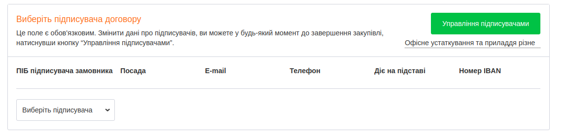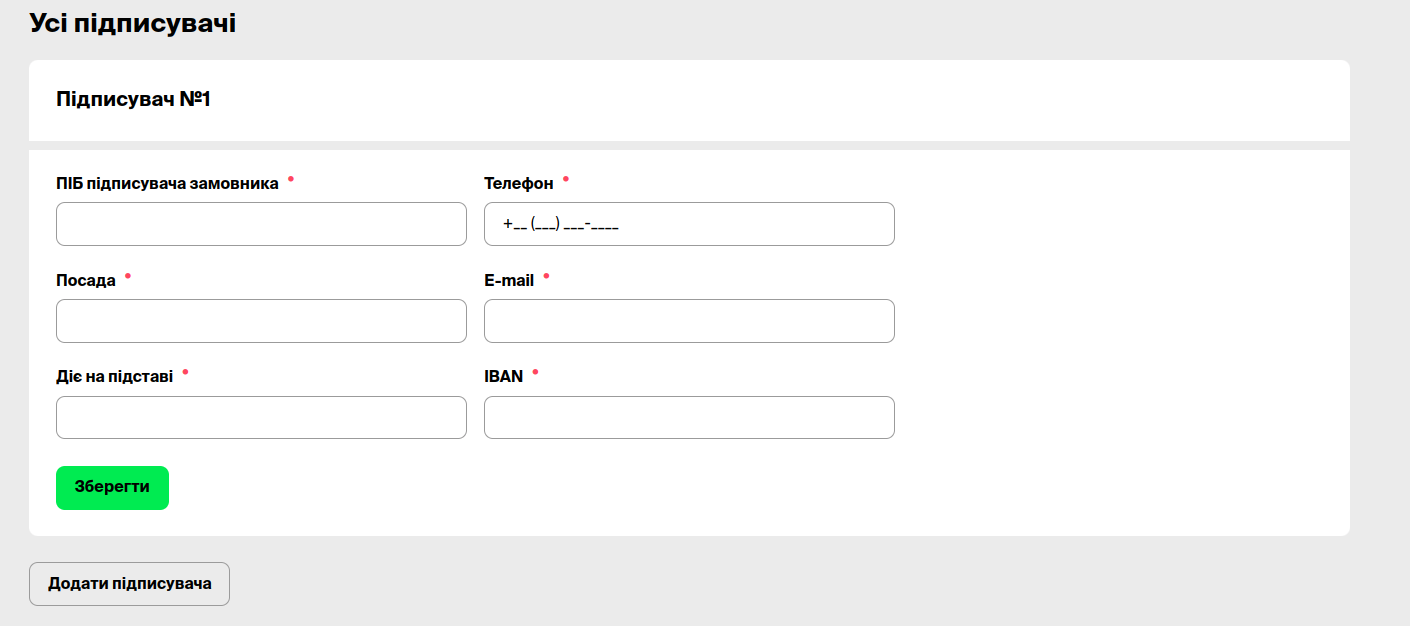 Інформація про підписувачів обов’язкова для заповнення з боку замовника та постачальника. Без неї замовник не може підписати завантажений договір та завершити закупівлю.