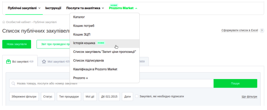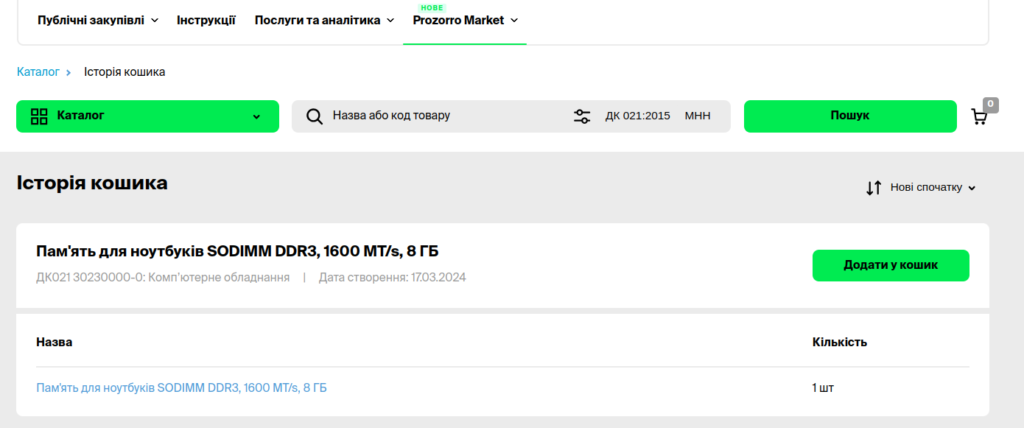 Для зручності замовників на майданчику з’явився новий функціонал – історія кошика, який дасть змогу покращити досвід роботи в Prozorro Market.