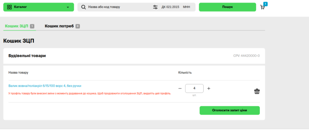 Якщо профіль закупівлі було змінено адміністраторами каталогу, то замовник при оголошенні запиту пропозицій побачить відповідне повідомлення і зможе відкоригувати дані закупівлі.