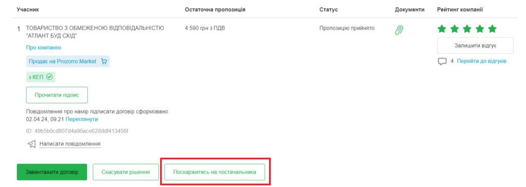 Якщо постачальник, пропонує товар, відмінний від поданої ним специфікації, то замовник має право поскаржитись на постачальника через електронний майданчик, натиснувши відповідну кнопку. Адміністратор розглядає звернення з інформацією про порушення протягом 10 робочих днів з дня отримання такого звернення.