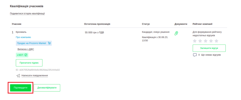 Відлік на укладання договору починається після того, як система автоматично визначила учасника переможцем, тому замовник має відразу натиснути кнопку “Підтвердити”, щоб мати можливість працювати з договором, або дискваліфікувати, якщо пропозиція підпадає під одну із трьох причин визначених п. 64.