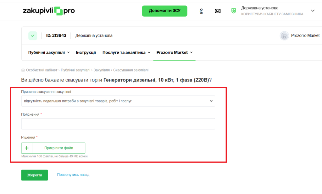 У випадку відміни запиту пропозицій, замовнику необхідно обов’язково зазначати причину такої відміни, також оприлюднює рішення в електронній системі закупівель протягом одного робочого дня з дня його прийняття.