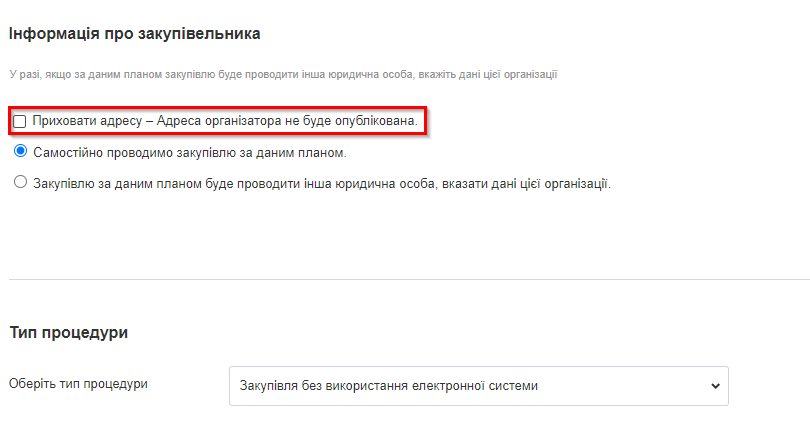 До речі щодо місцезнаходження. З 24.02.23 на майданчику з’явилась можливість приховати адресу замовника під час публікації річного плану: