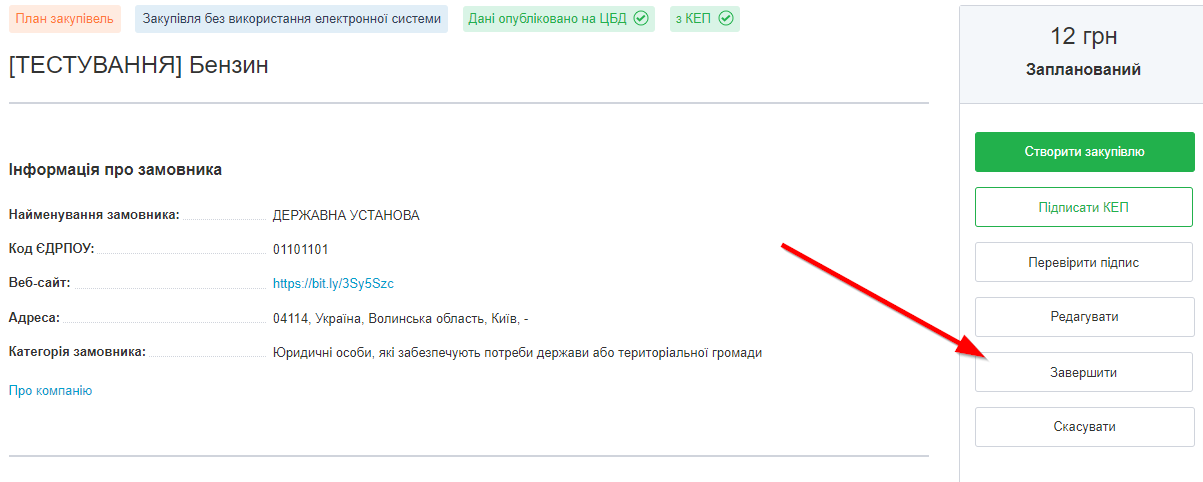 Після підписання договору ви можете залишити рядок річного плану в статусі “Запланований” (тобто нічого не робити), або ж можете перевести його в статус “Оголошено тендер”, показавши таким чином, що закупівля була проведена. Для цього на сторінці плану потрібно натиснути кнопку “Завершити”.